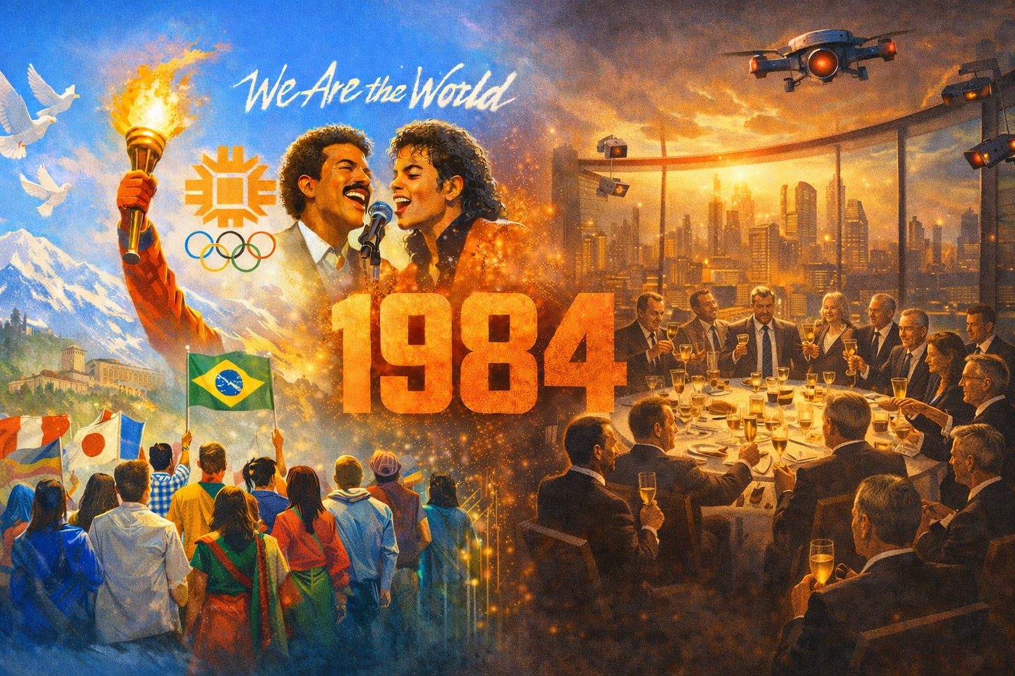 When Orwell wrote the novel in 1949, 1984 was a warning — a date projected into the future as a cautionary horizon. Yet when the real 1984 arrived, it did not look like Oceania. It looked like Sarajevo’s Olympic flame. It looked like musicians crowding around a microphone to sing for strangers. It looked like workers in Poland insisting that truth still mattered.